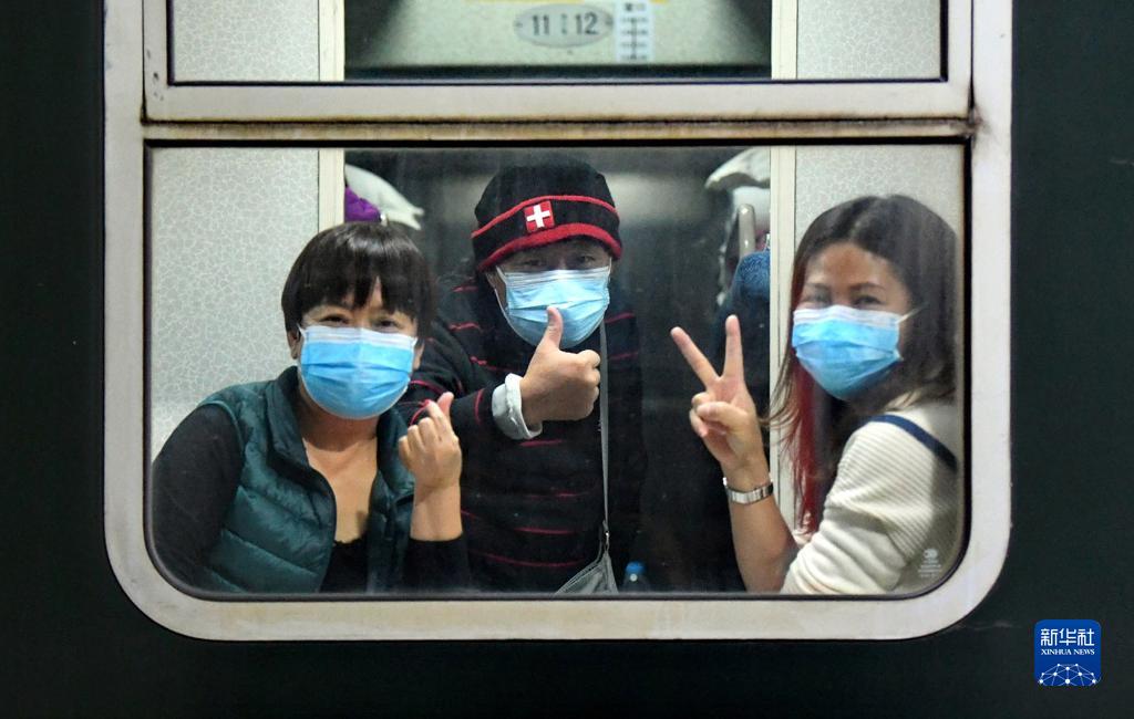 10月29日,滯留游客離開額濟納旗時,在列車車廂里與地面人員告別。新華社發(fā)(王磊 攝)