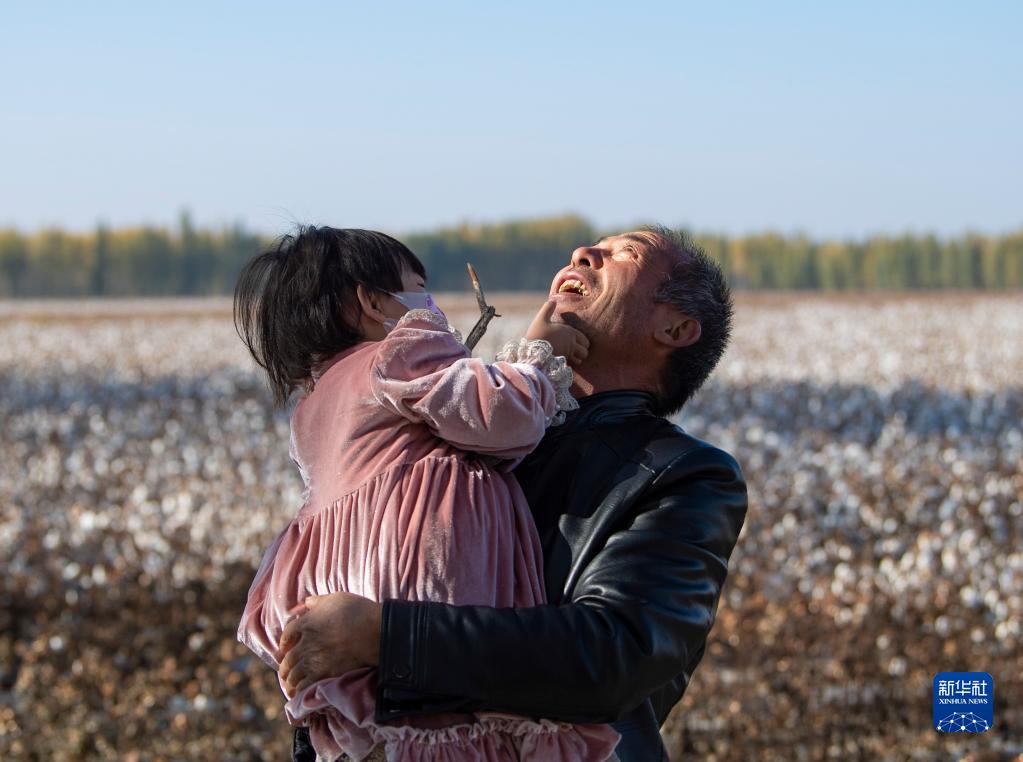 周末,家住市區(qū)的小孫女來(lái)到正在采收的棉田玩耍,陸高林抱起孫女逗樂(lè)(10月24日攝)。新華社記者 胡虎虎 攝