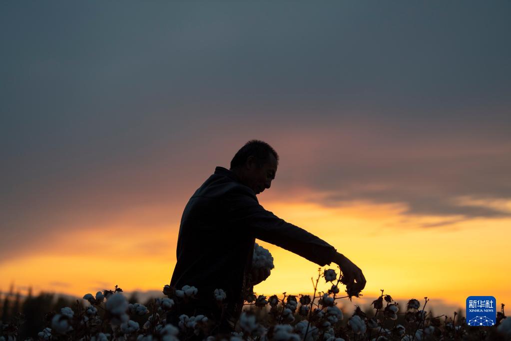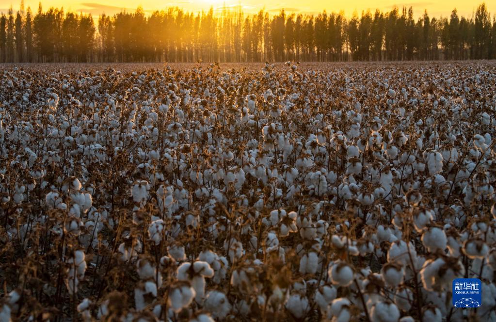 秋收時(shí)節(jié),雨過(guò)天晴,落日余暉灑落在陸高林家待采收的棉田里(10月23日攝)。新華社記者 胡虎虎 攝
