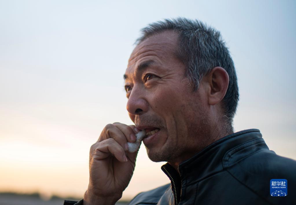 雨過(guò)天晴,因擔(dān)心棉花過(guò)濕而影響采收進(jìn)度,陸高林急忙來(lái)到棉田摘了一朵棉花,放進(jìn)嘴里咬破棉籽,看棉花被雨水淋濕的程度(10月23日攝)。新華社記者 胡虎虎 攝