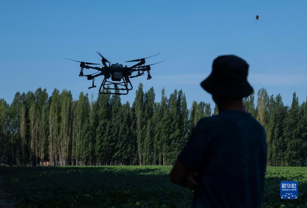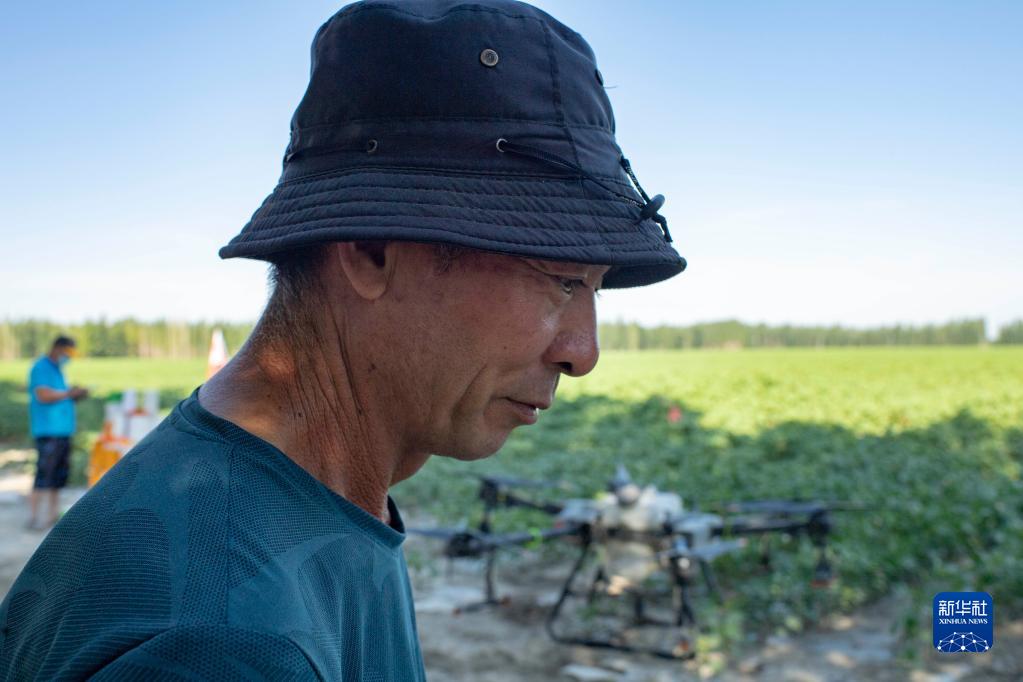 盛夏田間管理期間,雇人使用植保無(wú)人機(jī)后,陸高林不用再像往常一樣駕駛拖拉機(jī)進(jìn)棉田打藥,農(nóng)活變得更為輕松高效(7月15日攝)。新華社記者 胡虎虎 攝