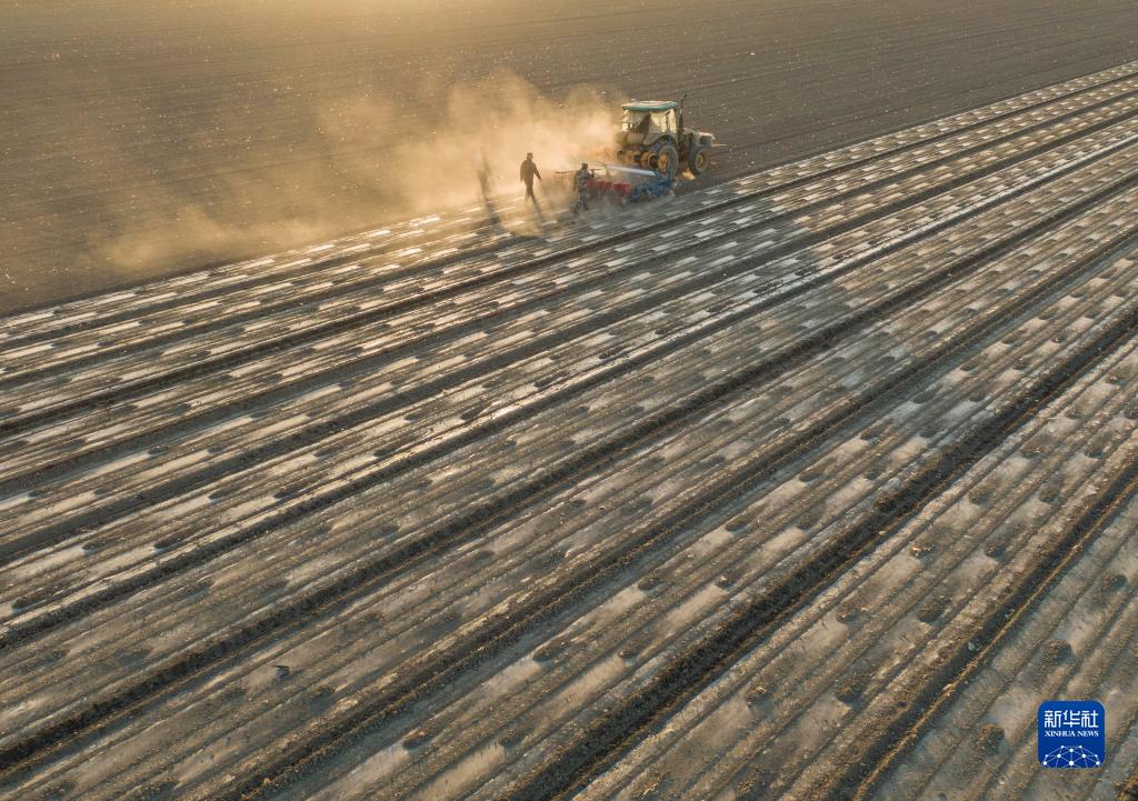 在新疆塔城地區(qū)沙灣市大泉鄉(xiāng)三道溝村,春播時(shí)節(jié),陸高林父子和雇來(lái)的工人一起操作機(jī)械在棉田里播種(4月15日攝,無(wú)人機(jī)照片)。新華社記者 胡虎虎 攝