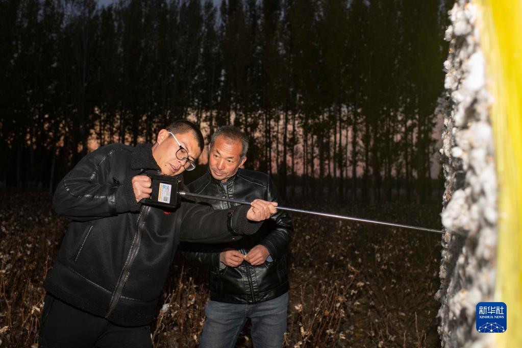 在新疆塔城地區(qū)沙灣市大泉鄉(xiāng)三道溝村,陸高林(右)和兒子陸德文使用儀器檢測(cè)已采收棉花的濕度(10月23日攝)。棉花售賣時(shí),軋花廠會(huì)對(duì)棉包進(jìn)行質(zhì)量抽測(cè),濕度過(guò)高會(huì)影響價(jià)格。新華社記者 胡虎虎 攝