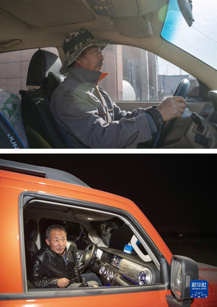 拼版照片:上圖為春播時(shí)節(jié),陸高林開(kāi)車載著農(nóng)資去棉田干活(4月15日攝);下圖為秋收時(shí)節(jié),陸高林在新?lián)Q的越野車內(nèi)等候采棉機(jī)轉(zhuǎn)場(chǎng)(10月22日攝)。新華社記者 胡虎虎 攝