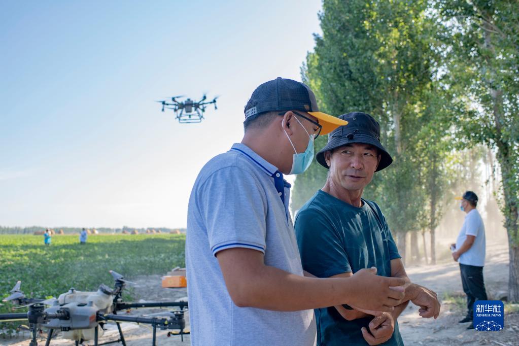 盛夏田間管理期間,陸高林(右)和沙灣市一家農(nóng)業(yè)服務(wù)團(tuán)隊(duì)負(fù)責(zé)人王福珖在棉田里談?wù)撧r(nóng)業(yè)植保無(wú)人機(jī)作業(yè)特點(diǎn)(7月15日攝)。新華社記者 胡虎虎 攝