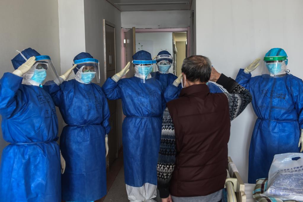 在中國湖北省婦幼保健院光谷院區(qū),一名即將出院的老年患者向醫(yī)護(hù)人員致敬(2020年3月14日攝)。新華社發(fā)(趙佳慶攝)