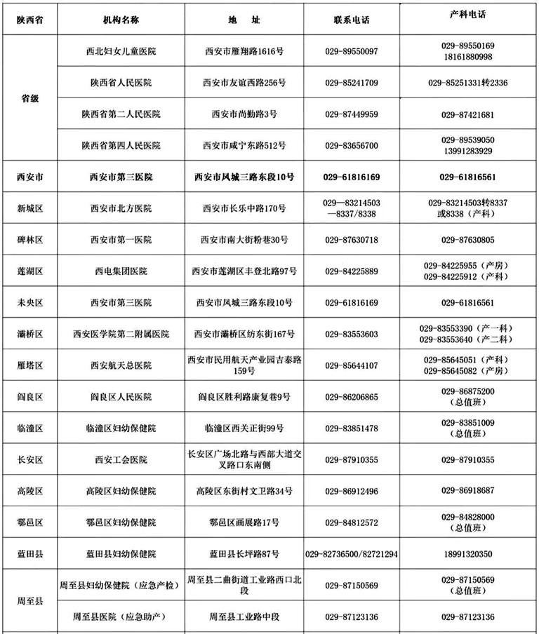 陜西省應(yīng)急助產(chǎn)機(jī)構(gòu)(部分)