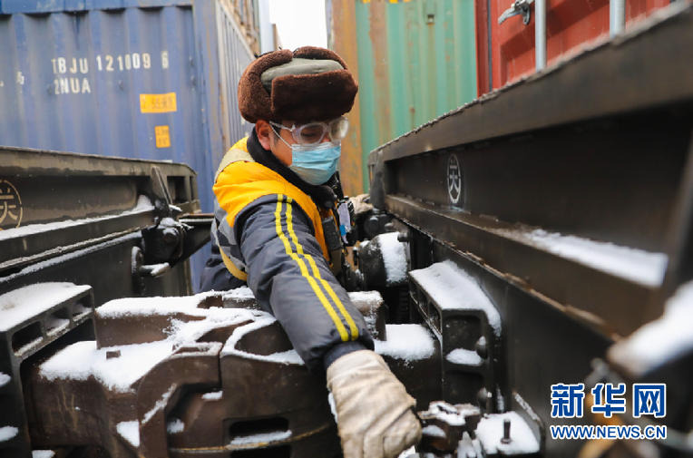 12月25日,X9003次中歐班列在雪中裝運(yùn)完畢,駛出西安國際港站。馬澤旭 攝