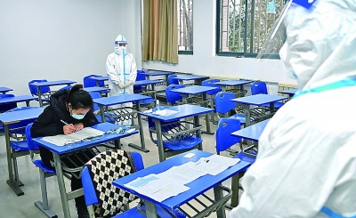 12月25日,西安外國(guó)語大學(xué)考點(diǎn)隔離考區(qū),監(jiān)考人員在單人隔離考場(chǎng)監(jiān)考。新華社記者 劉瀟攝