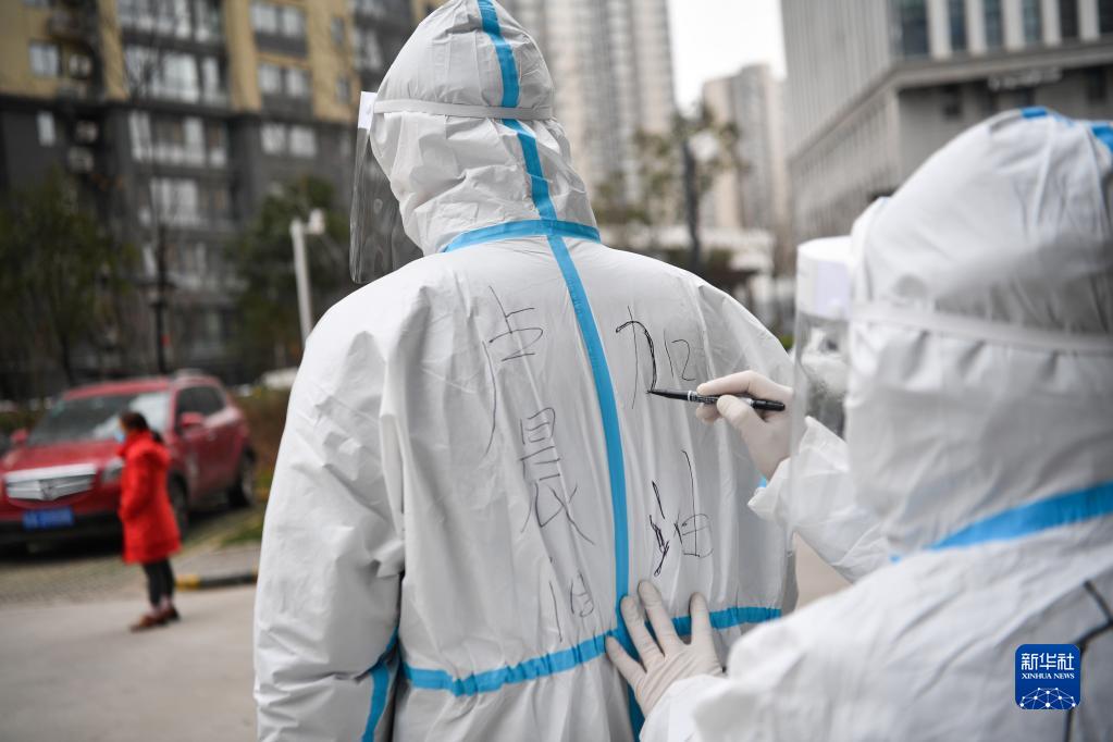 12月27日,在西安市雁塔區(qū)孟村小區(qū),社區(qū)工作人員在盧晨陽的防護(hù)服寫加油標(biāo)語。新華社記者 張博文 攝