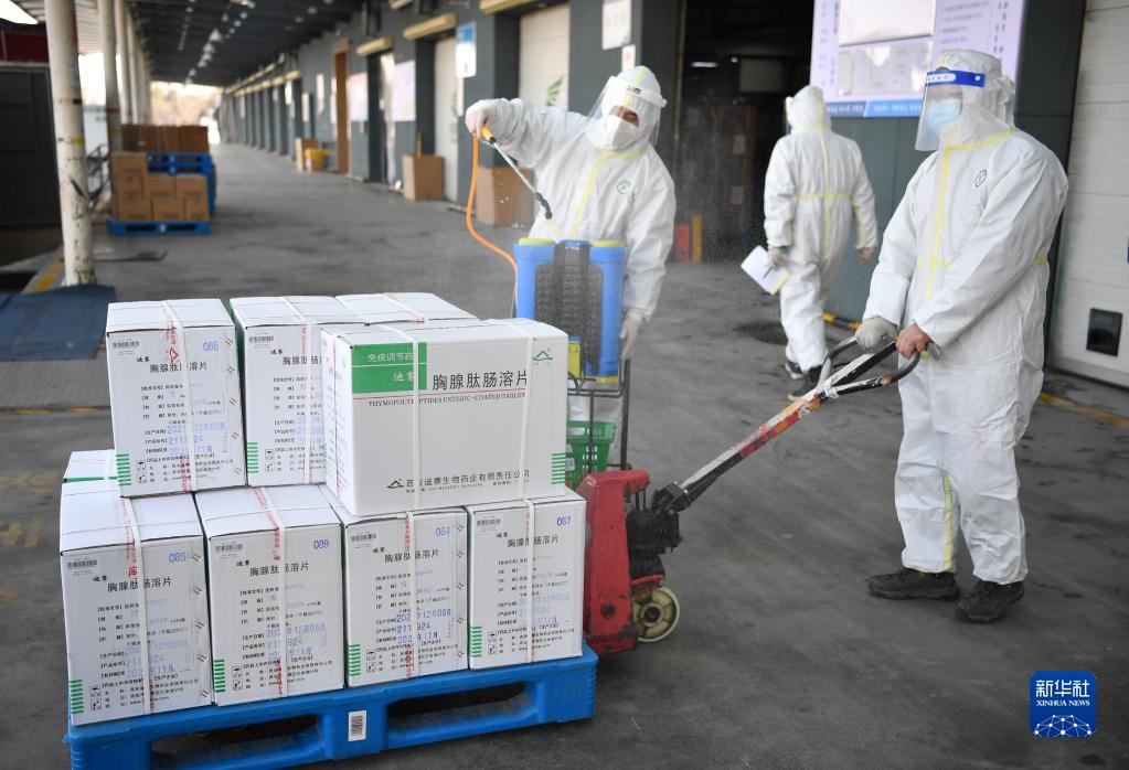 12月28日,陜藥集團(tuán)派昂醫(yī)藥公司工作人員對(duì)即將入庫的藥品進(jìn)行消殺。新華社記者 邵瑞 攝