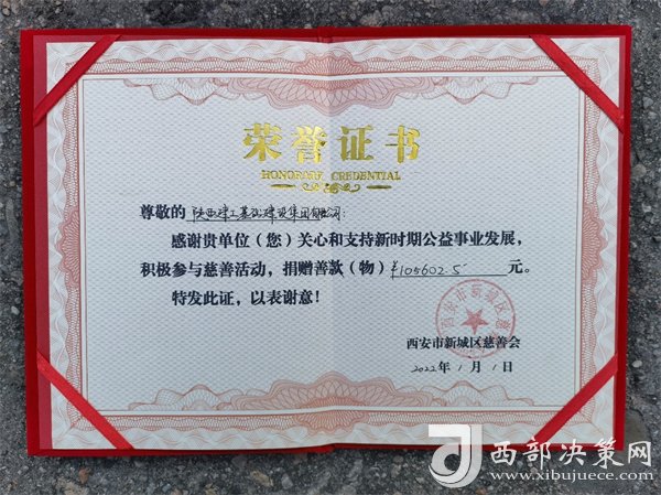 西安市新城區(qū)慈善協(xié)會(huì)向陜建基礎(chǔ)集團(tuán)頒發(fā)支持公益事業(yè)發(fā)展,積極參與慈善活動(dòng)的榮譽(yù)證書(shū)。