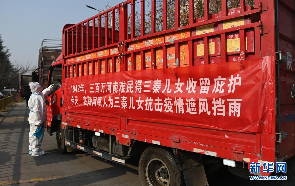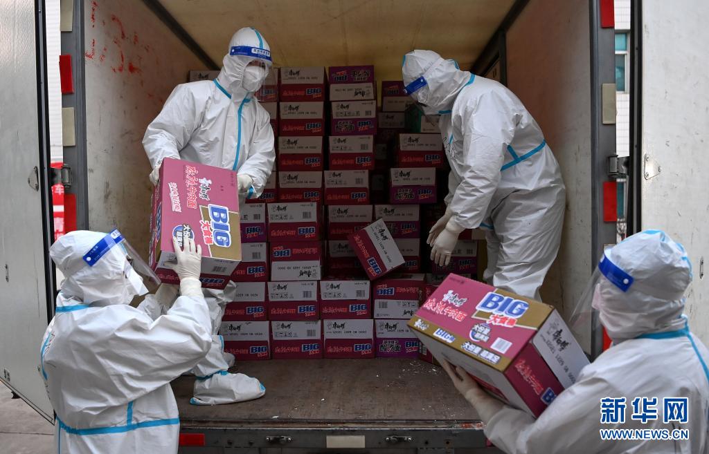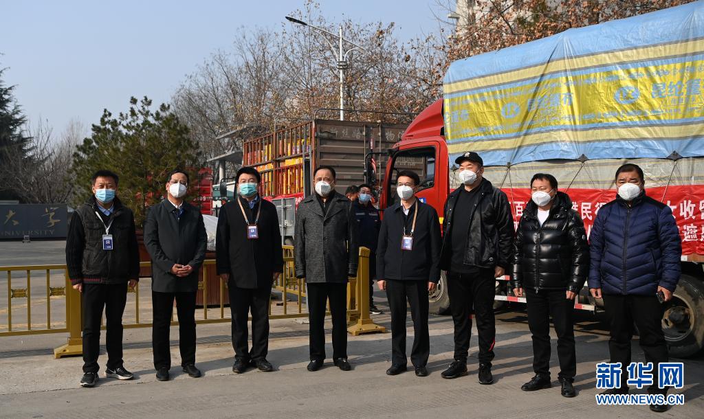 1月2日,西安醫(yī)學院的學生志愿者在搬運物資。當日,陜西省農(nóng)副食品商會向西安醫(yī)學院捐贈價值40余萬元的愛心蔬菜、食品物資、生活物資。