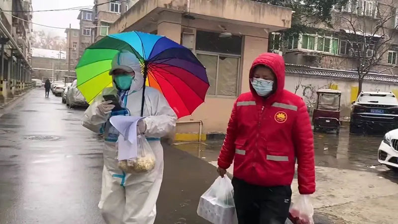 2021年12月25日,西安日報社記者李東峰(右)在采訪之余,為西安市蓮湖區(qū)勞動一坊社區(qū)居家隔離戶送菜。