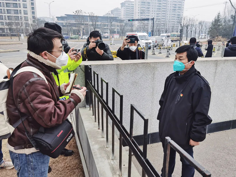 2022年1月4日,人民日報社記者原韜雄(左一)在新冠確診病例收治點西安市胸科醫(yī)院采訪。