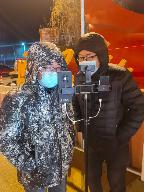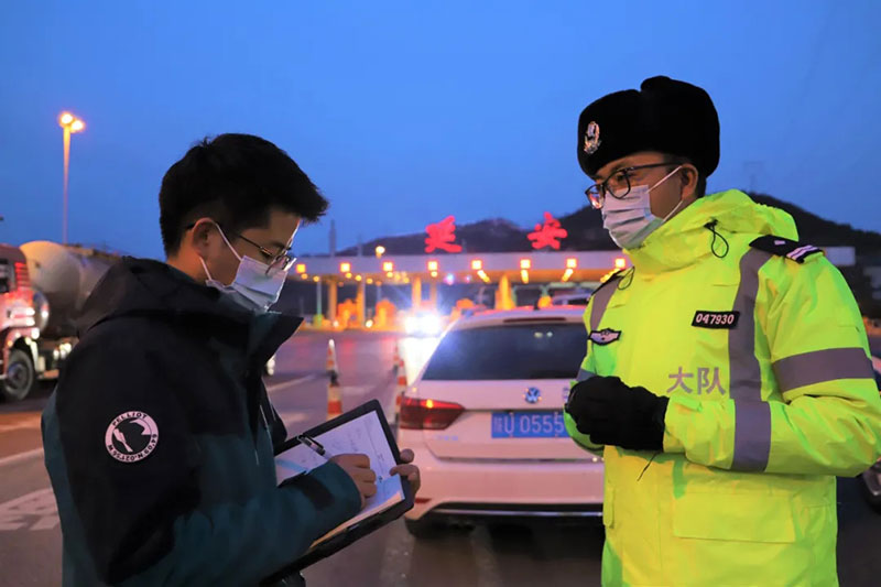 2021年12月24日,陜西日報社延安站記者陳宏江(左)在延安北高速公路口疫情防控檢查站采訪執(zhí)勤交警。