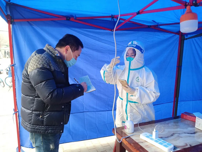 2021年12月23日,咸陽日報社記者李石(左)在全員核酸檢測點采訪。