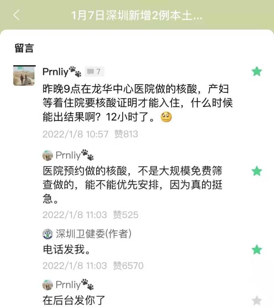 8日上午10時57分,在“深圳衛(wèi)健委”的微信公眾號推文下,一位叫“Prnliy”的網(wǎng)友留言,引起深圳市衛(wèi)健委工作人員的關(guān)注。這位網(wǎng)友說:“昨晚9點在龍華中心醫(yī)院做的核酸,產(chǎn)婦等著住院要核酸證明才能入住,什么時候能出結(jié)果???12個小時了。”