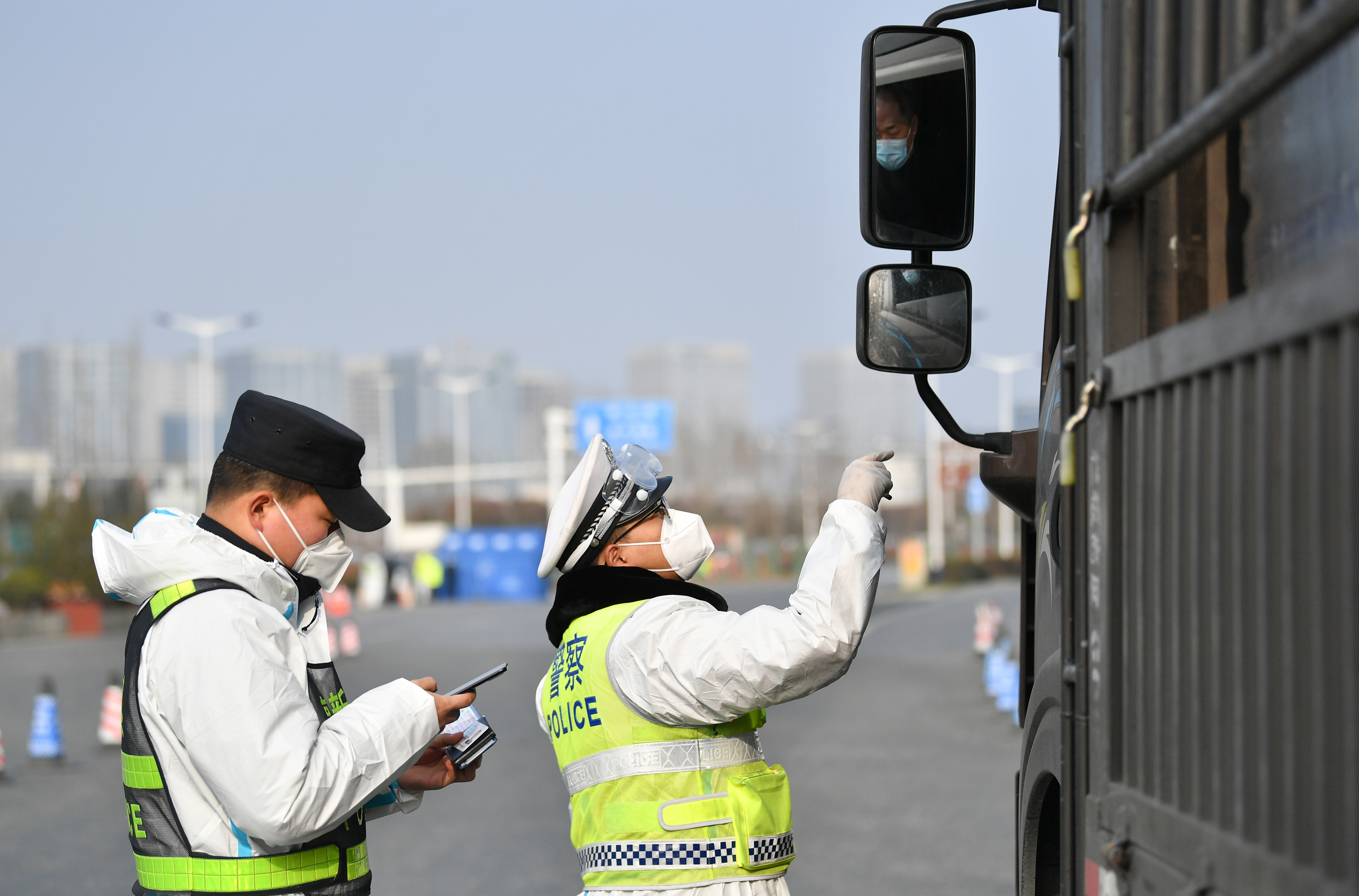 1月10日,西安市公安局浐灞生態(tài)區(qū)分局民警在西安市繞城高速新筑收費(fèi)站查驗(yàn)車(chē)輛通行證件。新華社記者 張博文 攝