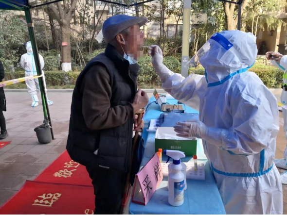 經(jīng)過星夜兼程,連夜入住酒店,開展各種培訓(xùn)、考核,為釆樣工作積極準(zhǔn)備著。12月19日,寶雞采樣隊(duì)接到的任務(wù)是支援浐灞金融園區(qū)全員的核酸釆樣工作。金融園區(qū)有將近9萬人 ,由于人口眾多,核酸釆集工作量大,時(shí)間要求緊迫,為了在規(guī)定時(shí)間內(nèi)完成釆樣任務(wù),寶雞采樣隊(duì)的隊(duì)員早出晚歸,每天休息時(shí)間很短暫,實(shí)在太累,常常在吃飯時(shí)打個(gè)盹。冬日的西安,寒風(fēng)凜冽,殘雪未消,嚴(yán)峻的疫情形勢(shì),絲毫沒有嚇倒可愛的隊(duì)員們,反而更加喚起大家的熱血斗志。西安的夜晚很冷,零下6-7℃更是常態(tài),隊(duì)員們從不怕冷,更不叫苦,依然堅(jiān)守在凌冽的寒風(fēng)中,在崗位上一干就是數(shù)個(gè)小時(shí),任務(wù)集中的時(shí)候,大家顧不上吃飯 ,穿著厚重的防護(hù)服 ,全副武裝 ,連呼吸都很困難。數(shù)個(gè)小時(shí)的連續(xù)做戰(zhàn),每個(gè)人都腰酸背痛,防護(hù)面屏上更是結(jié)起了一層薄冰 ,隊(duì)員們的手指被凍得腫脹通紅,冰冷的消毒水一遍遍刺激著隊(duì)員們的末梢神經(jīng),但這絲毫沒有影響他們工作的熱情 ,沒有一個(gè)人退縮,太冷了他們就在原地跺跺腳,大家相互加油打氣,只為凌晨的堅(jiān)守和不忘初心的使命!隊(duì)員們耐心地囑咐大家張開嘴巴,發(fā)出“啊”的聲音 ,一個(gè),兩個(gè),三個(gè)……這樣的動(dòng)作,重復(fù)了一遍又一遍。碰到年齡較小的幼童,核酸采樣人員更是顧不得地面冰涼,單膝跪地完成采樣。