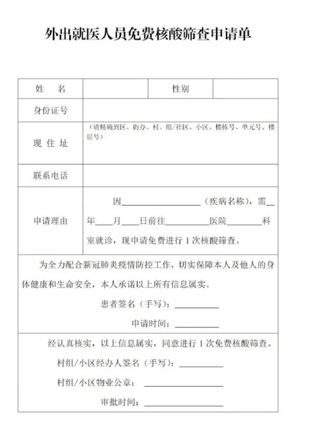 有就醫(yī)需求的居民請?zhí)顚憽锻獬鼍歪t(yī)人員免費(fèi)核酸篩查申請單》,經(jīng)村組或社區(qū)物業(yè)簽字蓋章后,前往新筑或新合社區(qū)衛(wèi)生服務(wù)中心進(jìn)行核酸篩查。
