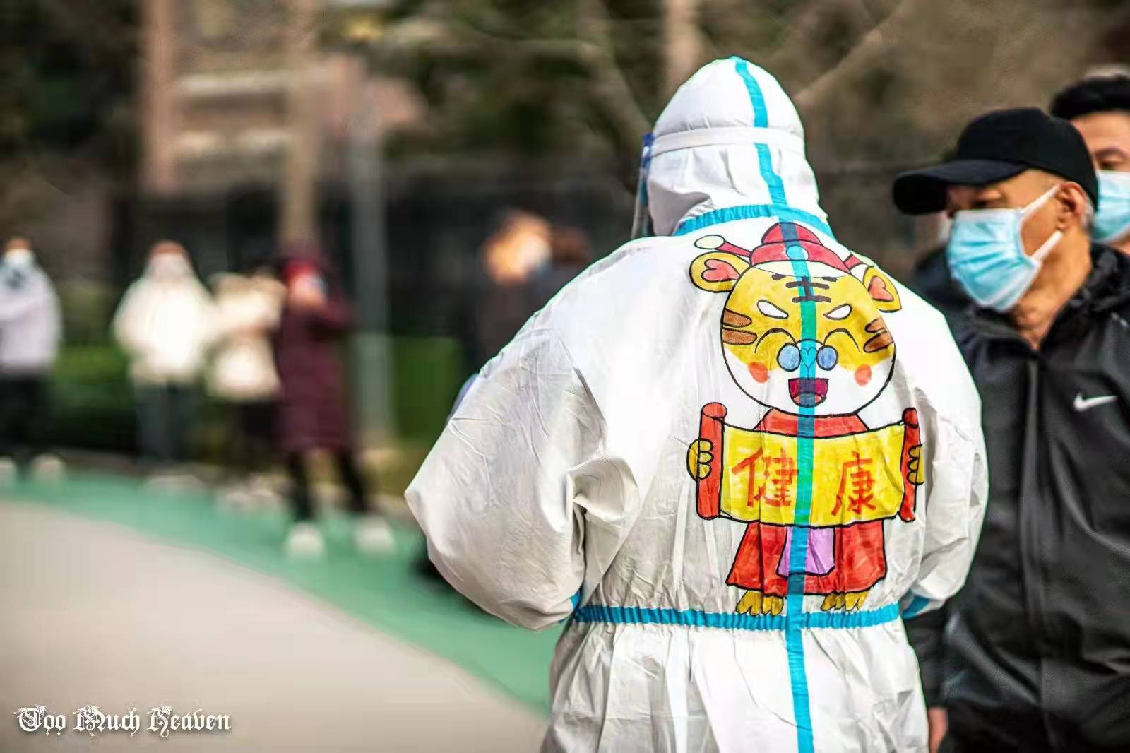 這個(gè)小區(qū)有13位志愿者組成了“抗疫志愿者先鋒隊(duì)”,全程協(xié)助醫(yī)護(hù)人員做好核酸篩查工作。隊(duì)長(zhǎng)黨王杰每天要在防護(hù)服上為大家編號(hào)、寫名字,以示區(qū)分。有一天,他寫著寫著突然來了主意,“在防護(hù)服上畫點(diǎn)不一樣的圖案行不行?疫情向好,新春臨近,來個(gè)虎年主題?”