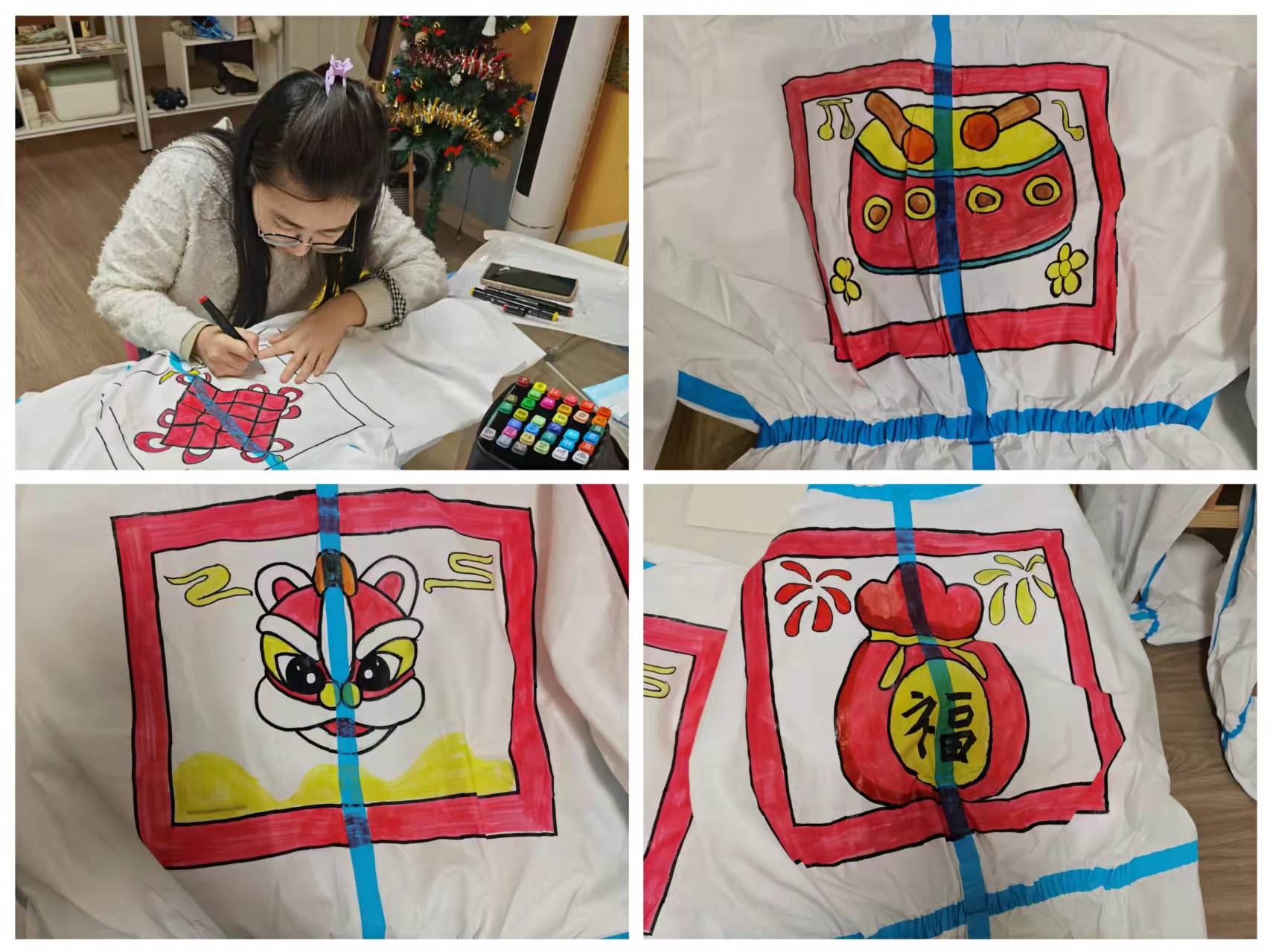 然而,令他們沒想到的是,“在防護(hù)服上作畫,有點(diǎn)難。”吳捷介紹,防護(hù)服的表面材質(zhì)是皺的,需要一手鋪平、另一手用馬克筆畫,“一幅畫畫下來,需要一個(gè)多小時(shí)。”這樣,他們熬了一個(gè)通宵,才完成了13幅作品。