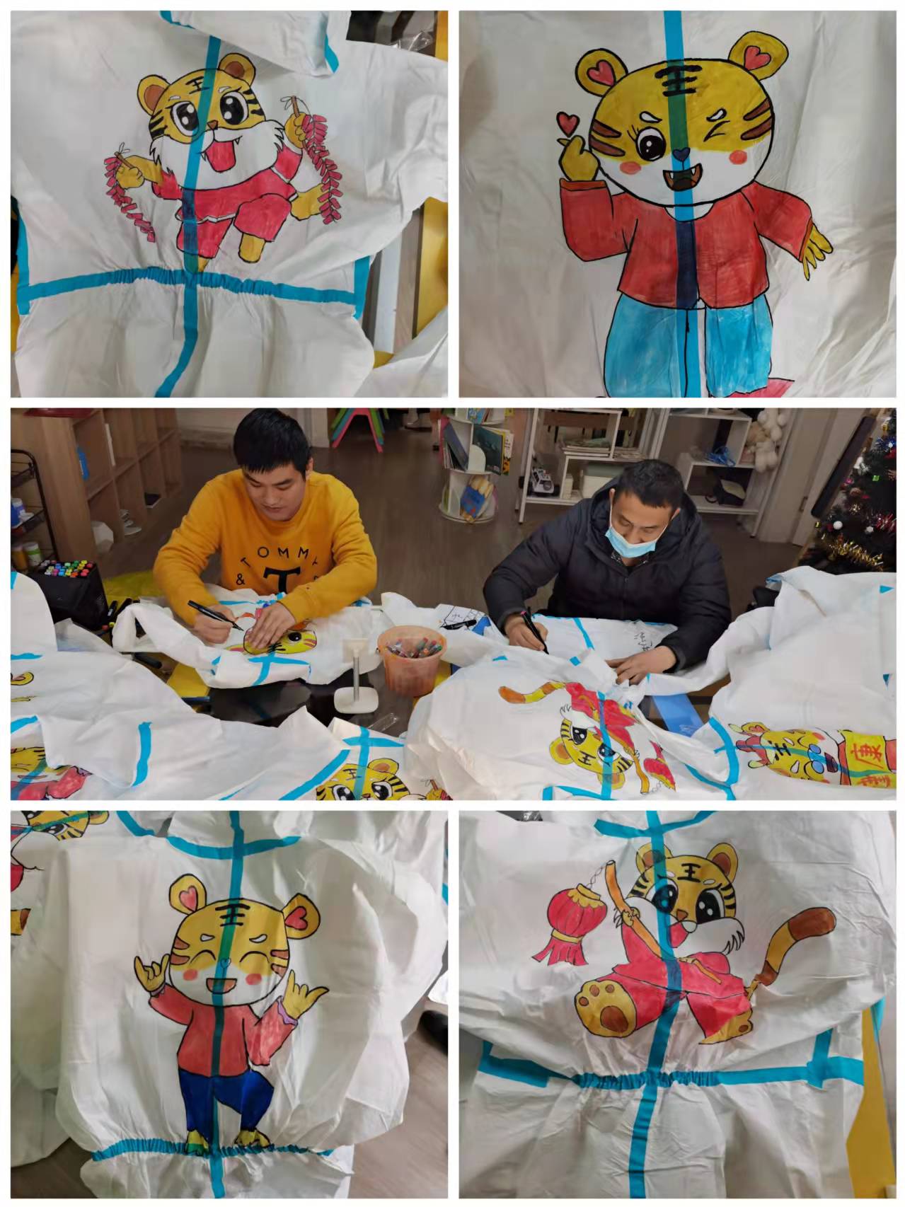 年輕人坐在一起“頭腦風(fēng)暴”,說干就干,思考、設(shè)計(jì)出了虎年主題的防護(hù)服系列圖案。吳捷說:“這一系列作品,就是希望大家虎虎生威,遠(yuǎn)離病毒!”