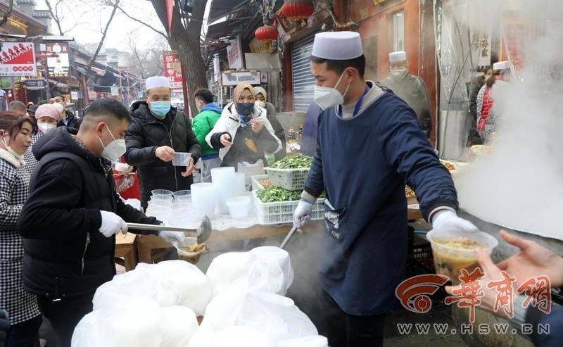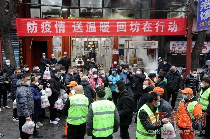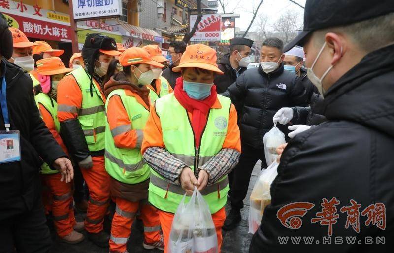 在回民街回坊老孫家泡饃店,服務(wù)員正在給周邊環(huán)衛(wèi)工免費(fèi)提供午飯。“自疫情嚴(yán)控以來,我們每天為周邊參加一線防疫工作者近千份清真熟食,以感謝他們對西安市防疫做出的貢獻(xiàn)。”該店負(fù)責(zé)人說。