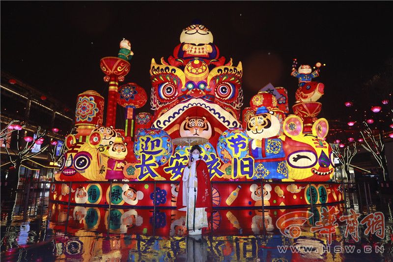 “虎虎生威”燈組坐落于街區(qū)地屏廣場處,底座直徑20米,高約15米,是大唐不夜城街區(qū)占地面積最大的一個燈組。燈組以生肖“虎”的Q版造型為主要形象,融入非遺布老虎和傳統(tǒng)虎頭帽等年節(jié)元素,展現(xiàn)了喜慶鬧春的生動景象。這組燈寓意喜慶納福、如意吉祥,將春節(jié)的福瑞和吉祥傳達給西安乃至全國人民。