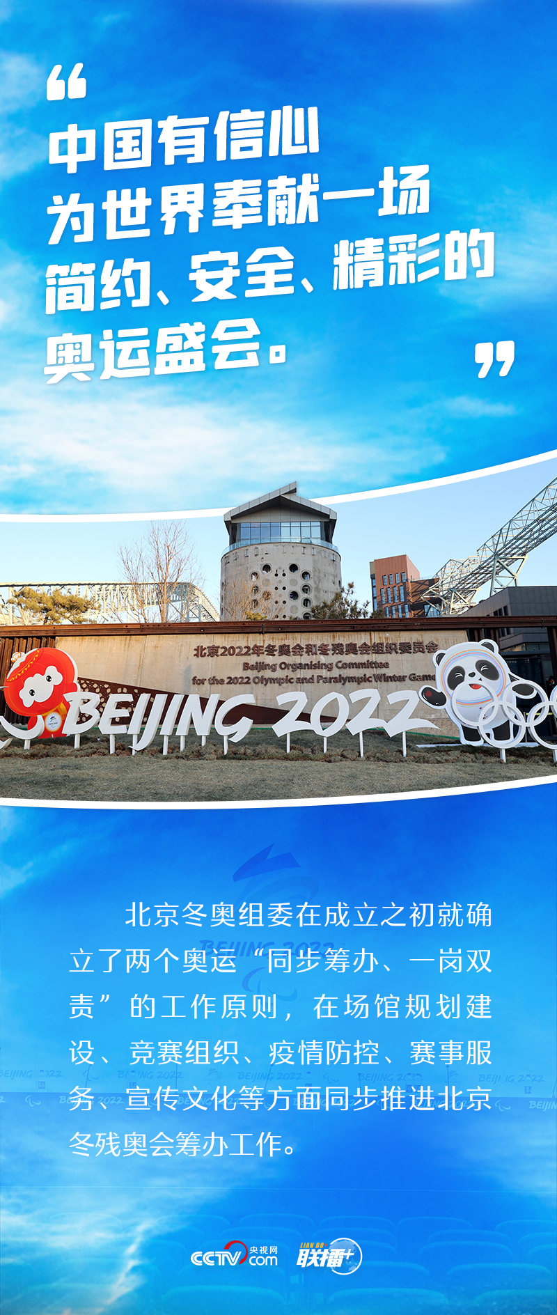 “兩個(gè)奧運(yùn),同樣精彩”,這是中國的莊嚴(yán)承諾。2015年夏天,北京攜手張家口獲得2022年冬奧會(huì)和冬殘奧會(huì)舉辦權(quán)。此后六年多,北京冬奧組委始終堅(jiān)持兩個(gè)奧運(yùn)“同步籌辦、一崗雙責(zé)”的工作原則,在場(chǎng)館規(guī)劃建設(shè)、競賽組織、疫情防控、賽事服務(wù)、宣傳文化等方面積極推進(jìn)籌辦工作,努力為廣大運(yùn)動(dòng)員提供一流的競賽場(chǎng)地和賽事服務(wù),創(chuàng)造良好的參賽體驗(yàn)和參賽環(huán)境。
