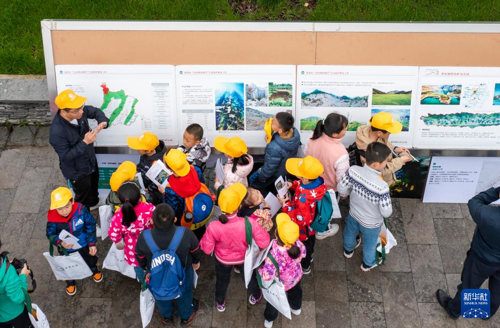 4月17日,參加活動的中小學生在地質(zhì)專業(yè)工作人員的帶領(lǐng)下,對銅鑼山礦山公園的地質(zhì)遺跡和生態(tài)修復進行科學考察(無人機照片)。