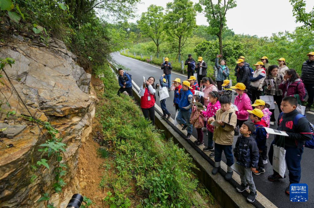 4月17日,參加活動的地學旅游愛好者、中小學生和部分媒體工作者,在地質(zhì)專業(yè)工作人員的帶領(lǐng)下進行銅鑼山科學考察。
