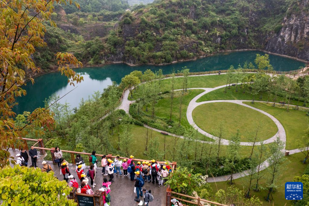 4月17日,地學旅游愛好者、中小學生和部分媒體工作者在地質(zhì)專業(yè)工作人員的帶領(lǐng)下,對銅鑼山礦山公園的地質(zhì)遺跡和生態(tài)修復進行科學考察(無人機照片)。