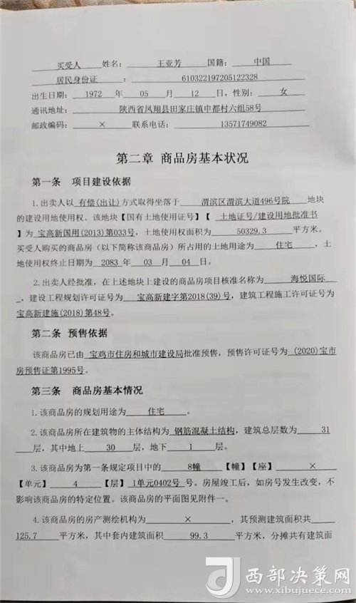 決策熱線|寶雞市民王女士(化名):我于2021年3月在寶雞市高新區(qū)渭濱大道臻和天下看了一套住宅樓,覺得地段位置也好。經(jīng)過(guò)和家人一起商議,與售樓人員確定了8幢1單元4層?xùn)|戶南北通透的房子,于2021年3月18日簽訂書面商品房買賣合同,于2021年4月15日簽訂按揭貸款合同給開發(fā)商交清了房款,前期共花費(fèi)七十余萬(wàn)。