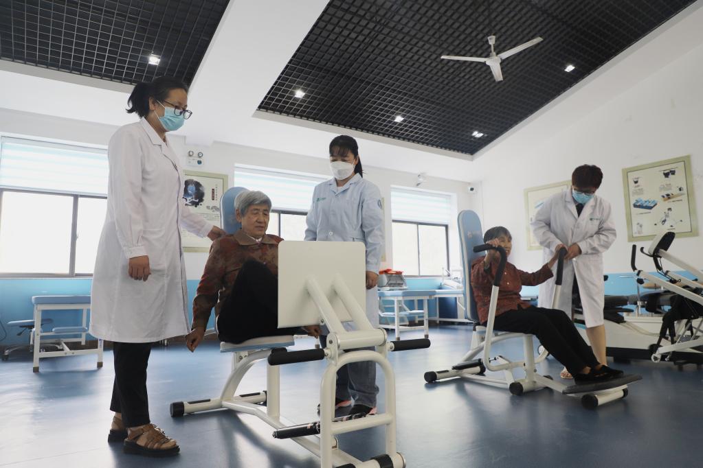 5月27日,在山東省博興縣呂藝鎮(zhèn)老年公寓醫(yī)養(yǎng)康復(fù)中心,醫(yī)護(hù)人員指導(dǎo)農(nóng)村老人利用專業(yè)器械進(jìn)行康復(fù)鍛煉。(博興縣委宣傳部供圖)