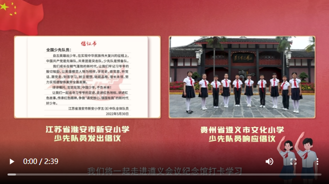 2022年5月30日,是江蘇省淮安市新安小學(xué)少先隊員們收到習(xí)近平總書記回信一周年的日子。近日,他們向全國少先隊員發(fā)出“跟著習(xí)爺爺?shù)淖阚E學(xué)黨史”的倡議。貴州省遵義市文化小學(xué)的少先隊員們第一時間響應(yīng)倡議,追尋習(xí)爺爺?shù)淖阚E,打卡遵義會議紀念館,講述紅色故事,傳承紅色基因。