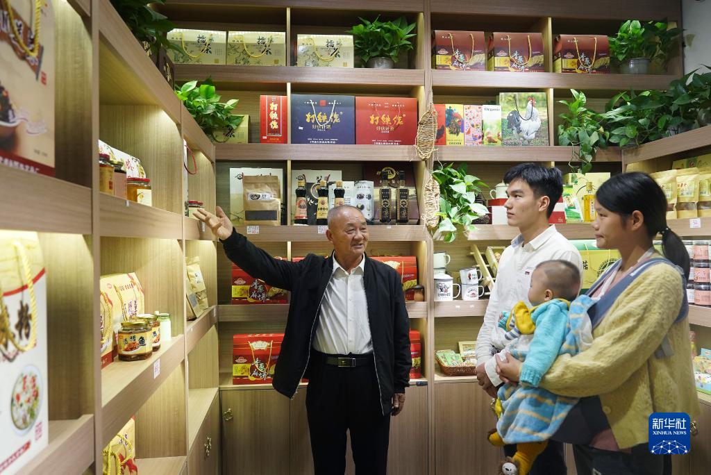 2020年10月21日,江西省贛州市于都縣梓山鎮(zhèn)潭頭村村民孫觀發(fā)(左一)向游客介紹當(dāng)?shù)氐奶厣r(nóng)產(chǎn)品。 新華社記者 萬(wàn)象 攝