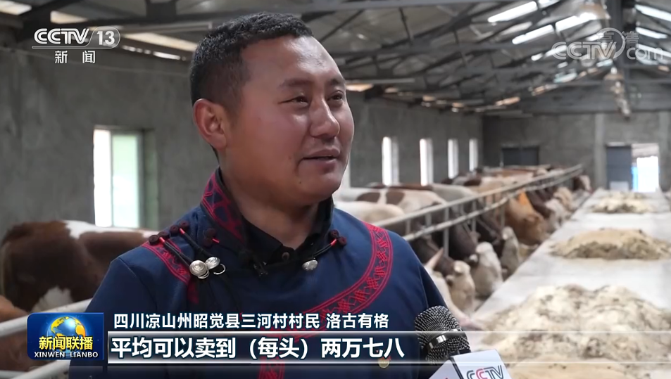 四川涼山州昭覺(jué)縣三河村村民 洛古有格:當(dāng)時(shí)總書(shū)記來(lái)的時(shí)候,我們這個(gè)養(yǎng)牛只有十幾頭。通過(guò)發(fā)展,我們?nèi)哟逵辛?000多頭這個(gè)西門(mén)塔爾?!,F(xiàn)在我們這個(gè)牛,平均可以賣到(每頭)兩萬(wàn)七八,大的可以賣到三萬(wàn)多元,效益特別好。