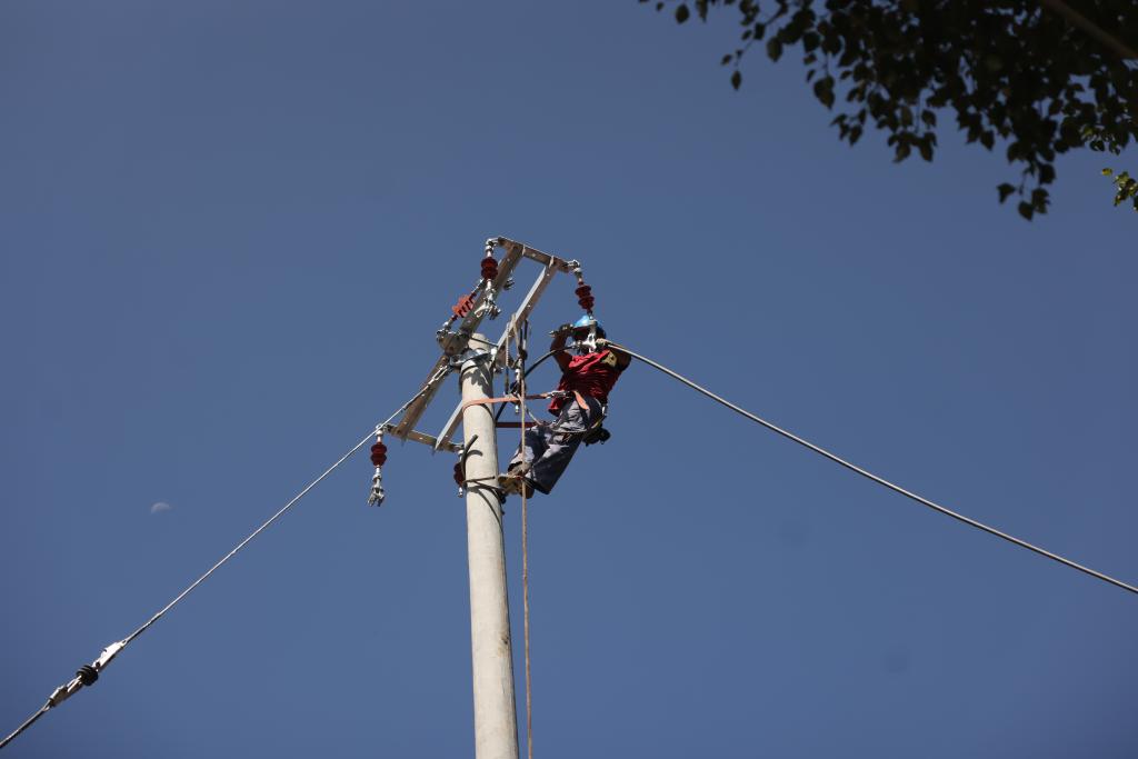 8月20日,在青海省西寧市大通回族土族自治縣青山鄉(xiāng)沙岱村,西寧電力實(shí)業(yè)有限公司職工在檢修電路。(新華社記者李寧 攝)
