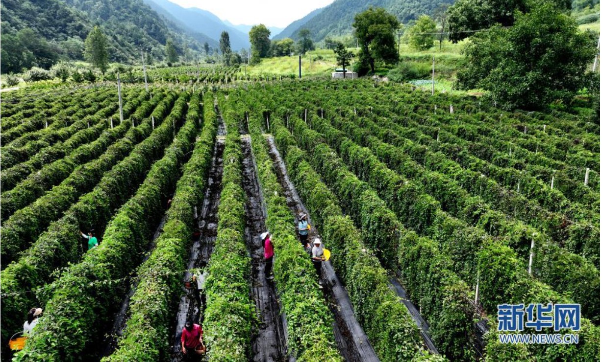 8月21日,洛南縣煜正中藥材專業(yè)合作社的員工在田間采摘五味子(無人機照片)。新華社記者 陶明 攝