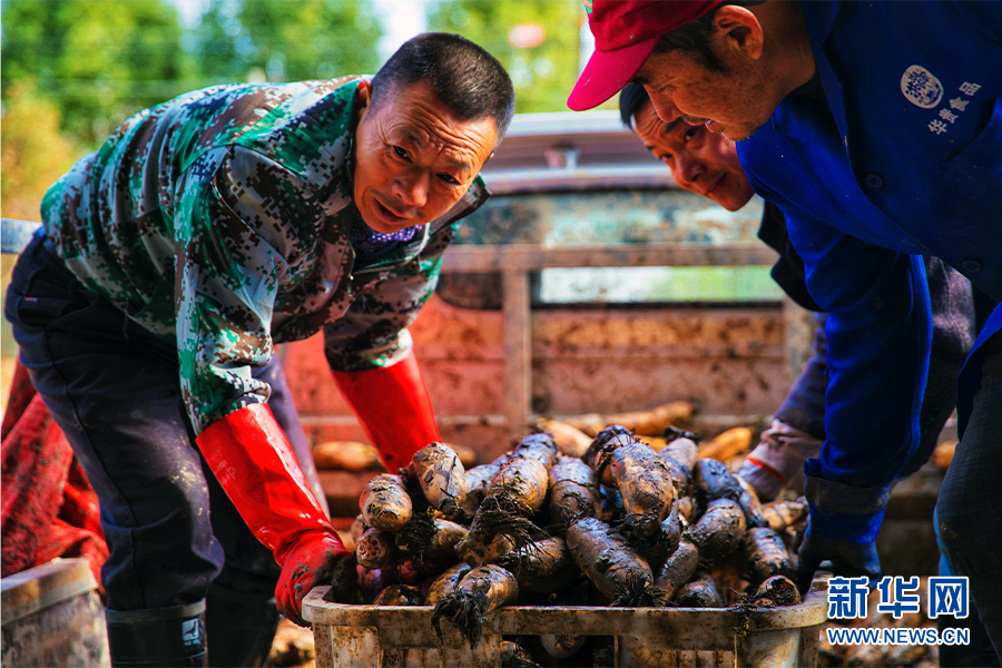 圖為藕農(nóng)正在往加工工廠運送自己采收的新鮮蓮藕。新華網(wǎng)發(fā)(受訪者提供)
