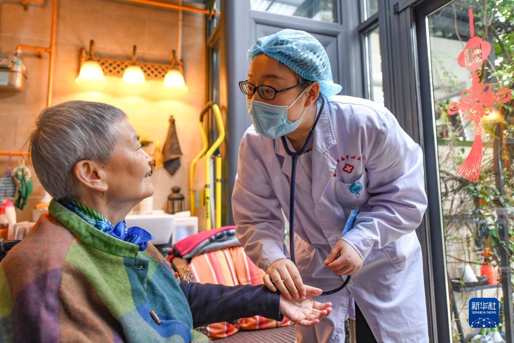 在四川省成都市溫江區(qū)萬(wàn)春鎮(zhèn)天鄉(xiāng)路社區(qū)居民家中,家庭醫(yī)生楊靜(右)在詢問居民葉茂群近期的身體情況(2022年5月18日攝)。新華社記者 王曦 攝