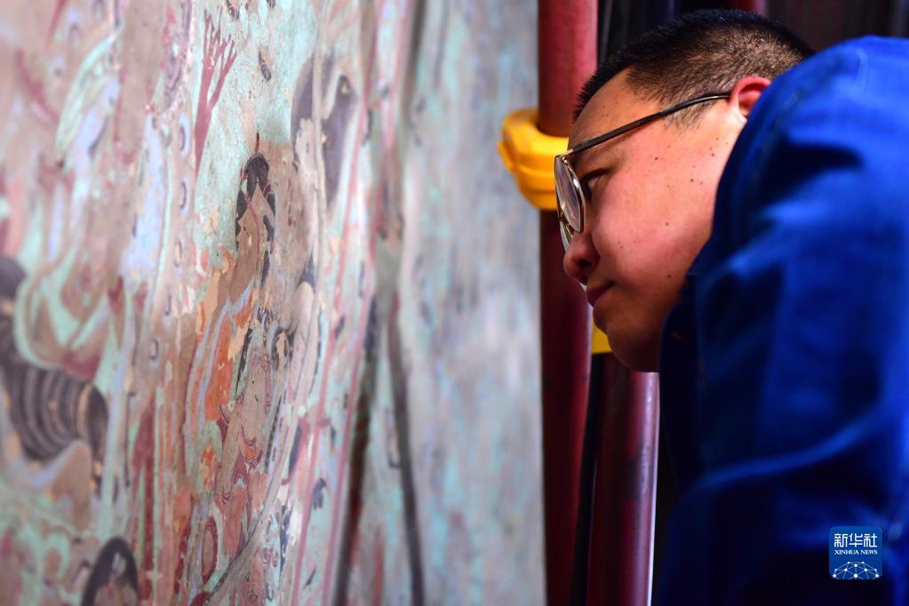 在莫高窟第231窟,敦煌研究院文物保護(hù)技術(shù)服務(wù)中心的壁畫(huà)修復(fù)工作者在修復(fù)出現(xiàn)病害的壁畫(huà)(2022年4月19日攝)。新華社記者 杜哲宇 攝