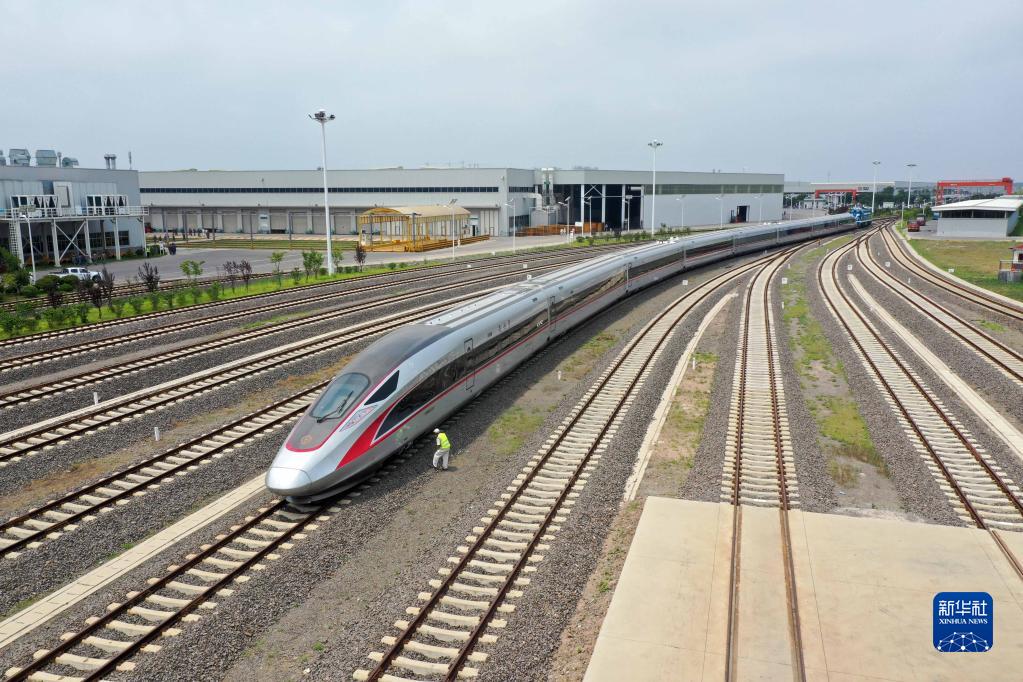 在位于山東青島的中車(chē)四方股份公司,一輛復(fù)興號(hào)列車(chē)正在出廠(2021年7月1日攝)。新華社發(fā)