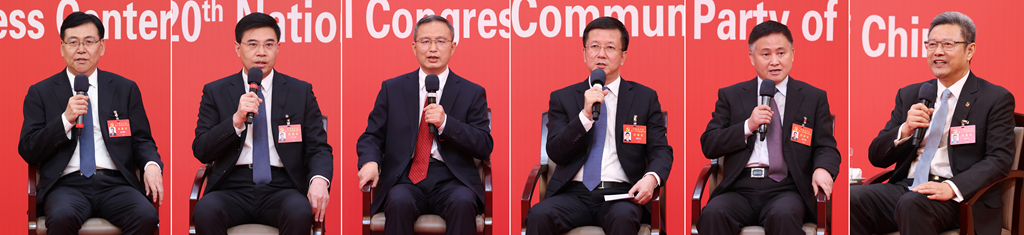 10月20日,中國共產(chǎn)黨第二十次全國代表大會(huì)新聞中心舉行集體采訪。青海、寧夏、新疆、中央和國家機(jī)關(guān)、中央金融系統(tǒng)、中央企業(yè)系統(tǒng)(在京)代表團(tuán)新聞發(fā)言人出席,介紹代表團(tuán)學(xué)習(xí)討論二十大報(bào)告情況,并回答記者提問(拼版照片)。新華社記者 張玉薇 攝
