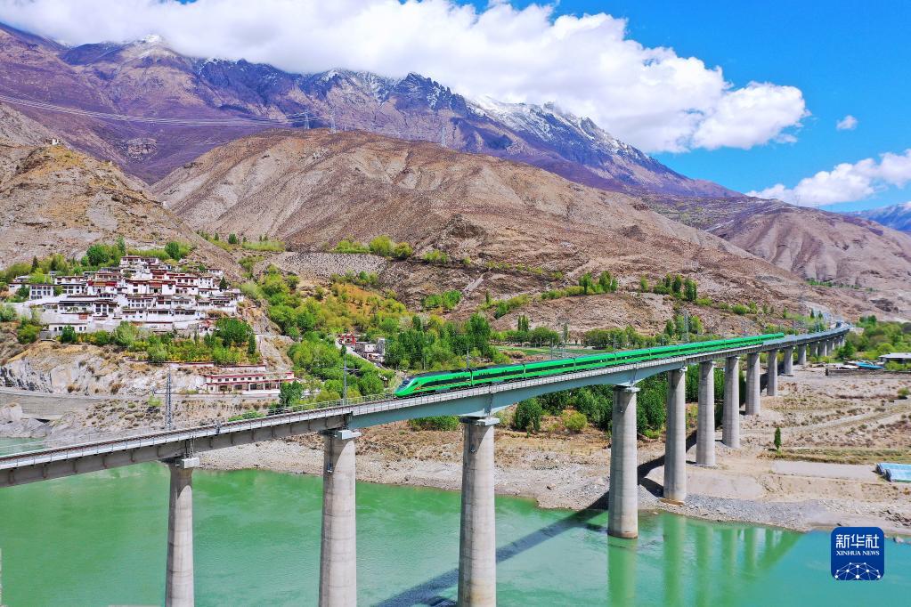 復興號列車行駛在西藏朗縣境內(2022年4月14日攝)。新華社記者 覺果 攝