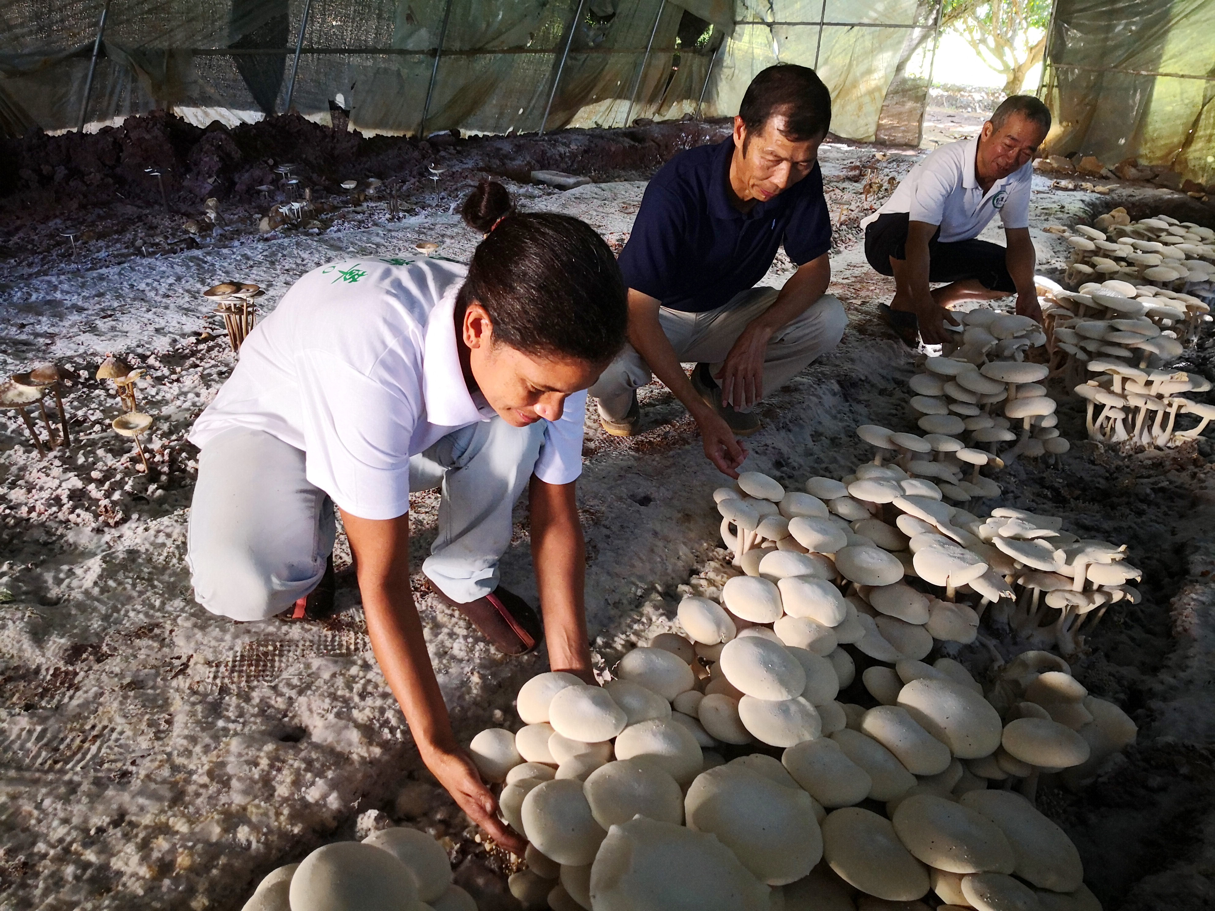 在斐濟(jì)楠迪,中國(guó)專(zhuān)家和當(dāng)?shù)毓蛦T檢查菌菇生長(zhǎng)情況(2018年6月12日攝)。新華社記者 張永興 攝