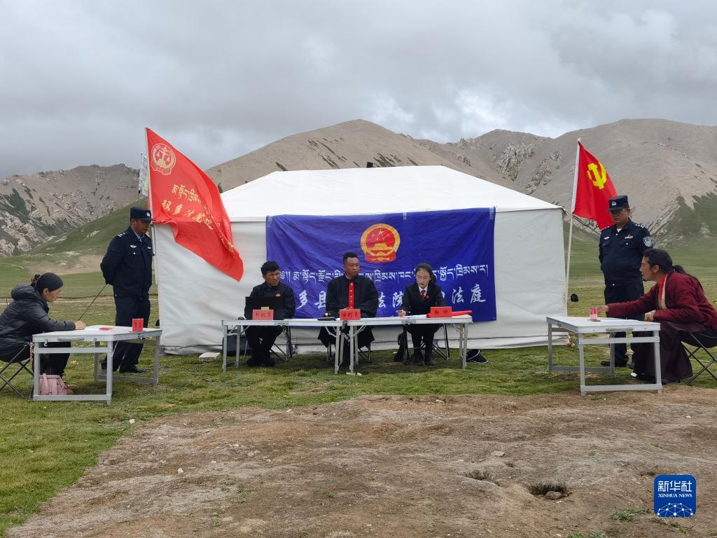 2022年7月14日,在瑪多縣花石峽鎮(zhèn),瑪多縣人民法院法官在審理案件。新華社發(fā)