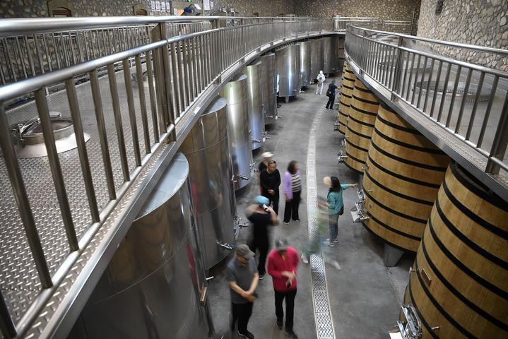 6月8日,在位于賀蘭山東麓的志輝源石酒莊,游客在釀酒車間參觀游覽。新華社記者 王鵬 攝